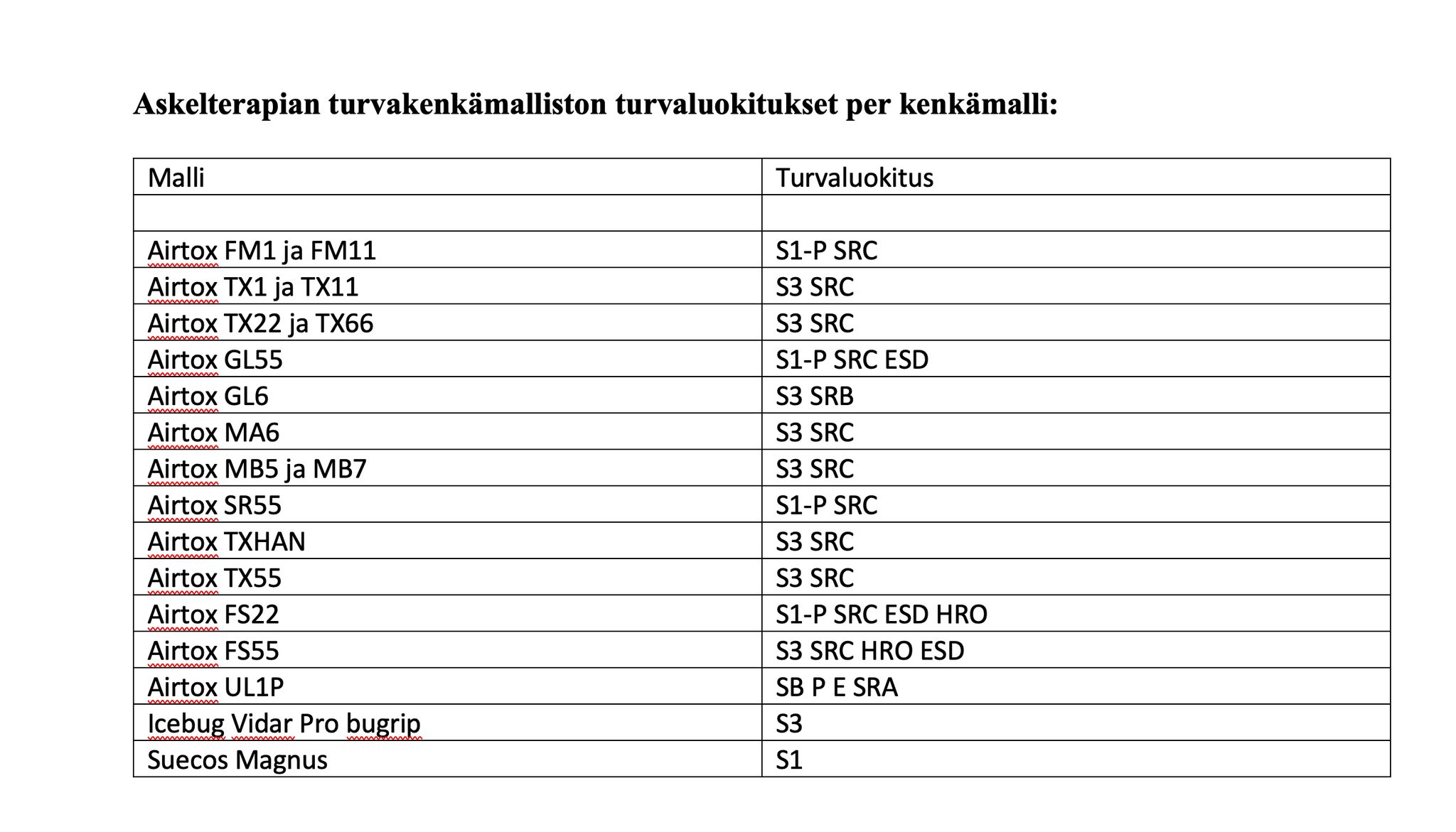 HUOM! Tarkista mahdolliset työantajan tai vakuutuksen asettamat vaatimukset turvakenkien ominaisuuksista juuri kyseiseen työtehtävään.