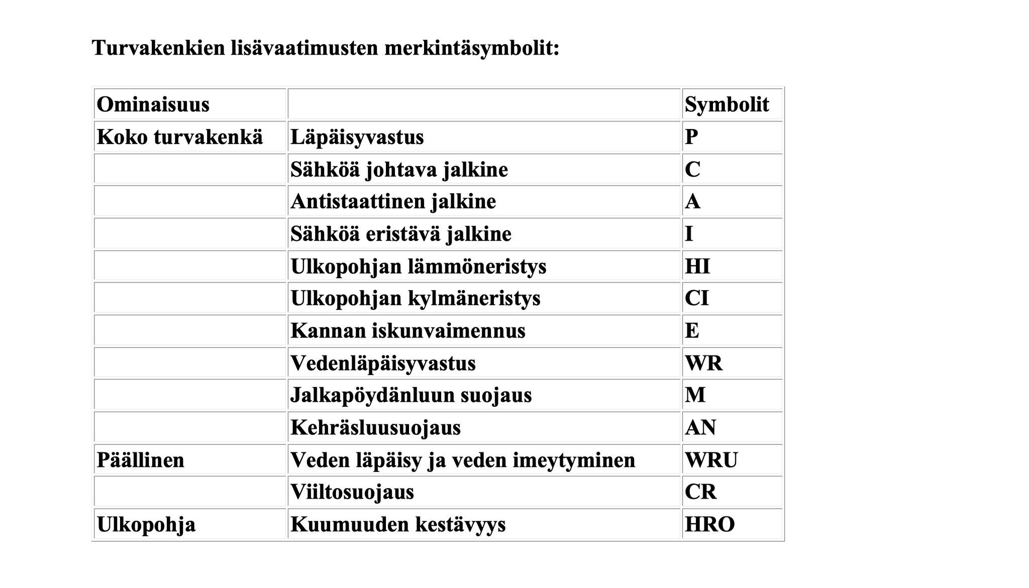 Turvakenkien ominaisuusmerkinnät