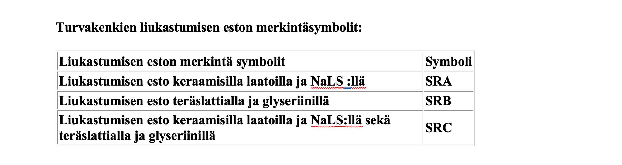 Luokitusta tarkennetaan lisäksi erilaisilla numeroilla ja lisäkirjaimilla. Turvakenkien liukastumisenestoluokitus määritellään kolmella portaalla SRA, SRB ja SRC luokilla.